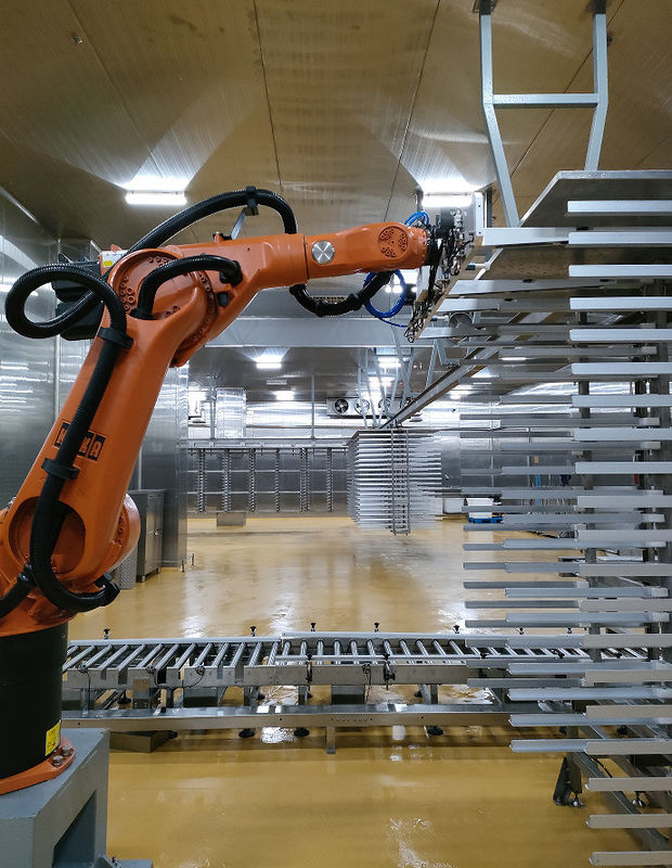 أدوات نهاية متخصصة: تم تجهيز الروبوت بـ أدوات إمساك أو أنظمة تفريغ مصممة للتعامل مع منتجات غذائية معينة بلطف وأمان دون التسبب في تلف.